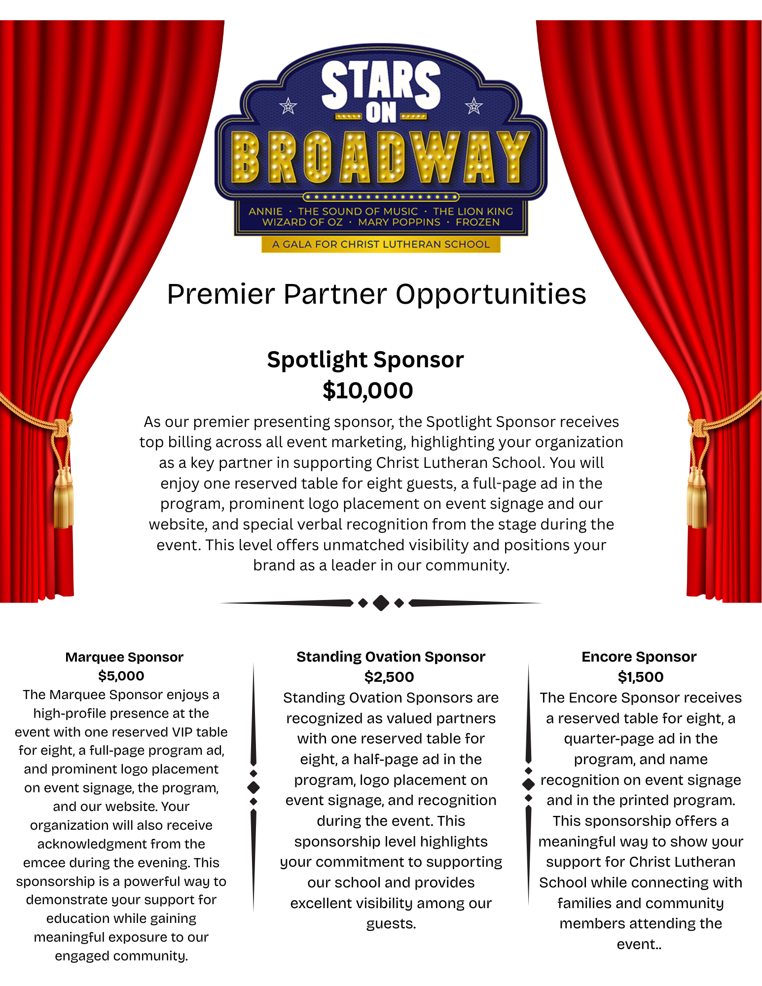 Sponsorship allows us to fund the event ahead of time, providing a strong foundation for the evening. This does not replace our beloved silent and live auctions—instead, it enhances them. With key costs covered in advance, the gala can focus more fully on joyful generosity, meaningful fellowship, and celebrating the good work God is doing at Christ Lutheran.